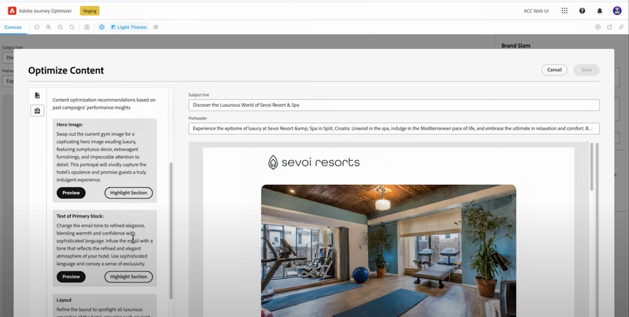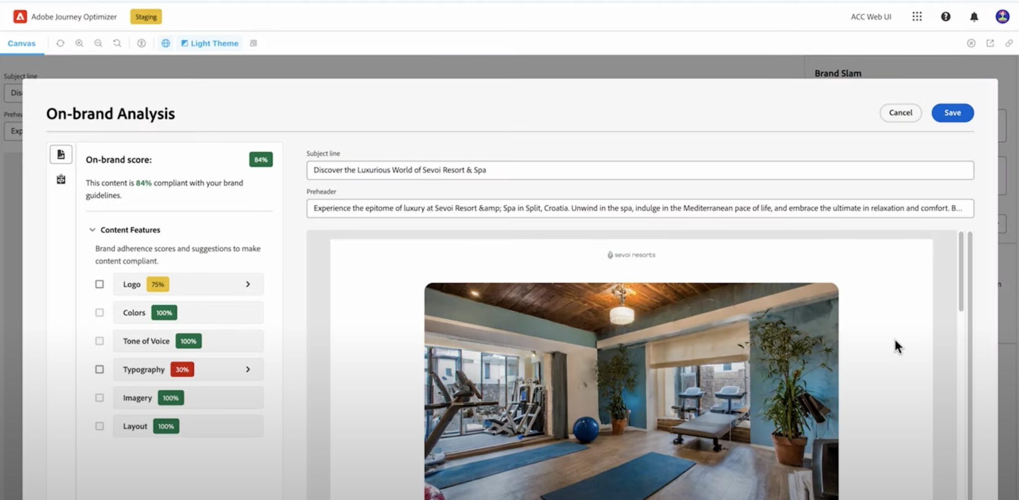 Adobe’s AI-driven tool assesses content within Journey Optimizer against brand guidelines, providing scores and suggesting adjustments in real-time to ensure that all communications are not only on-brand but also optimized for performance.